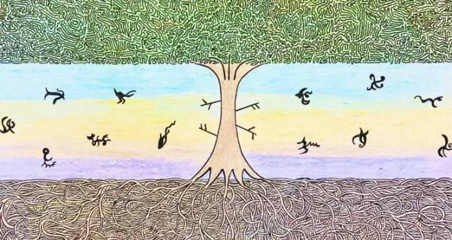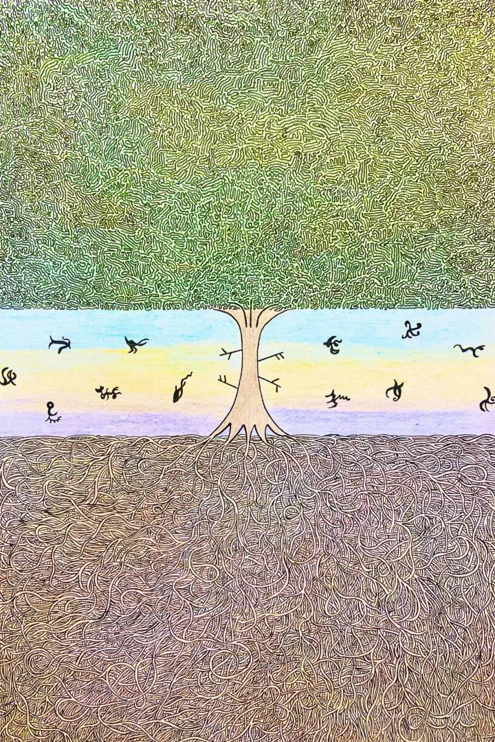 木を人生に例えており、上の葉っぱの部分は未来が広がっていく様子を、下の根っこの部分は過去の努力が張り巡らされている様子を描きました。どちらも果てしなく続いており、「人生は続く。諦めない限り可能性は広がっていく」という想いを込めました。愛知県名古屋市の北区役所で開催された作品展のチラシ絵コンテストでは最優秀賞を頂くことができ、とても自信が深まった作品です。