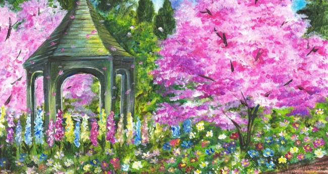 春の公園に、散歩がてらお花見に来ています。桜も、地面に群生している花々も満開。うららかな春の陽射しを浴びて、歩いている自分自身も思わず小走りしたくなる、楽しい気持ちになれる。そんな明るい一枚です。