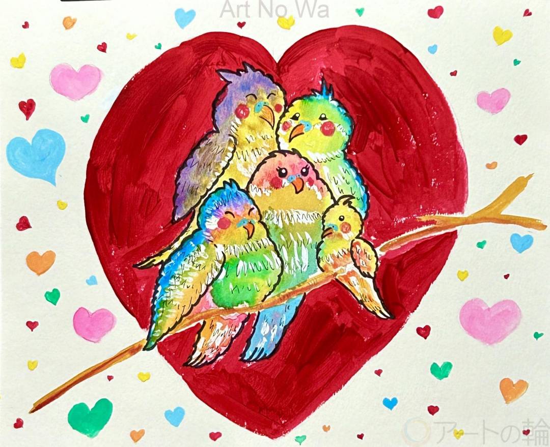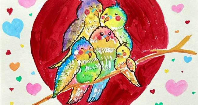 インコの家族が互いを支え合い愛情に包み合う姿を描きました