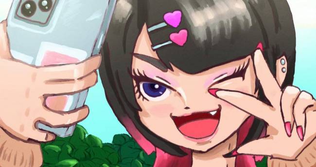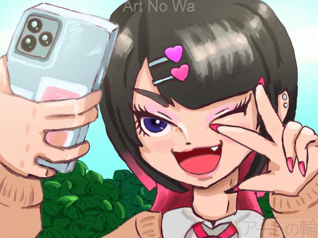 自撮りをしながらピースをするギャル風の女の子のイラストです。配色や全体のバランスにこだわって描きました。