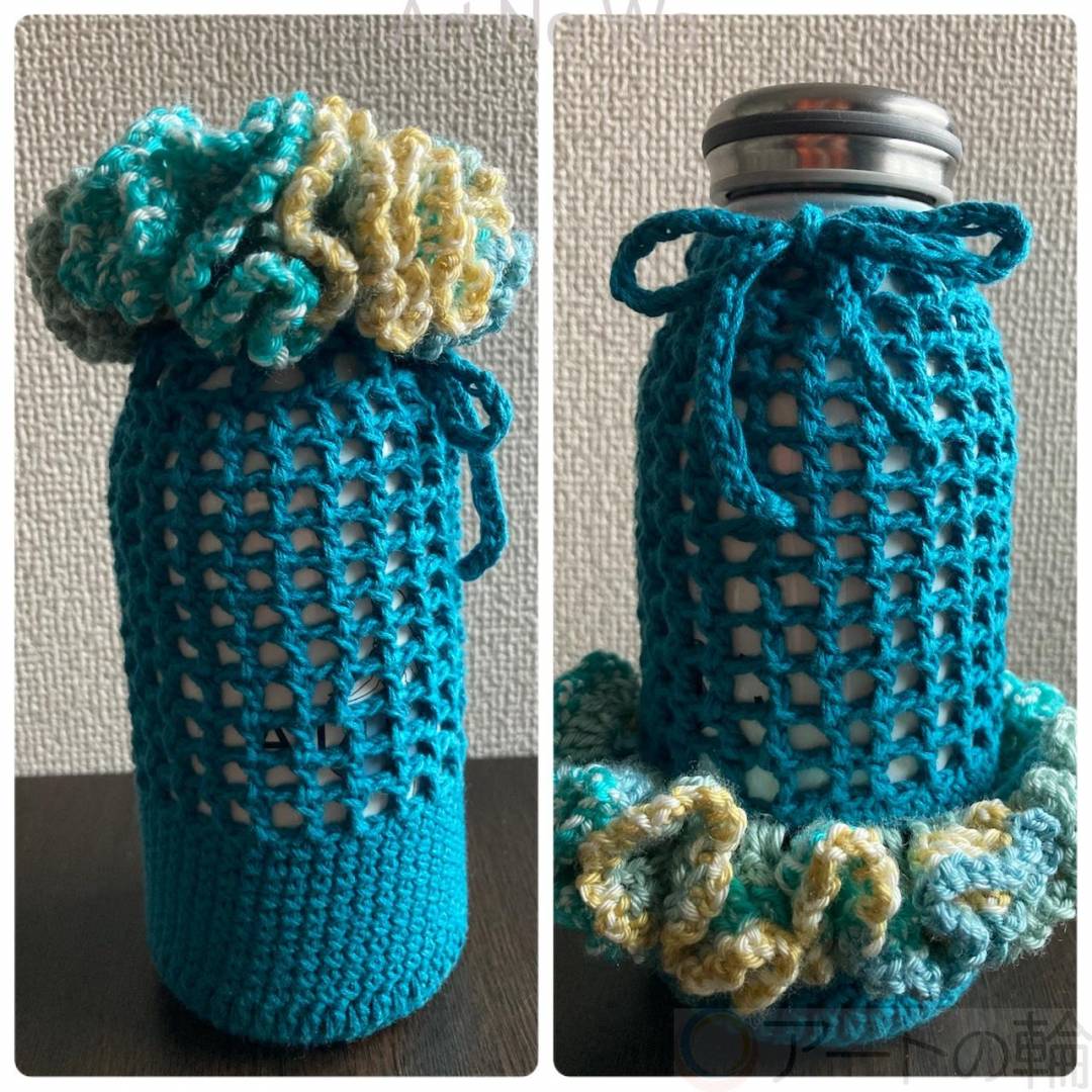 氷と雪と白鳥と空、街の灯りや朝陽、そういった冬ならではの水色と淡い黄色と少しの白をモチーフにしたシュシュと水筒ケースをこしらえてみました。