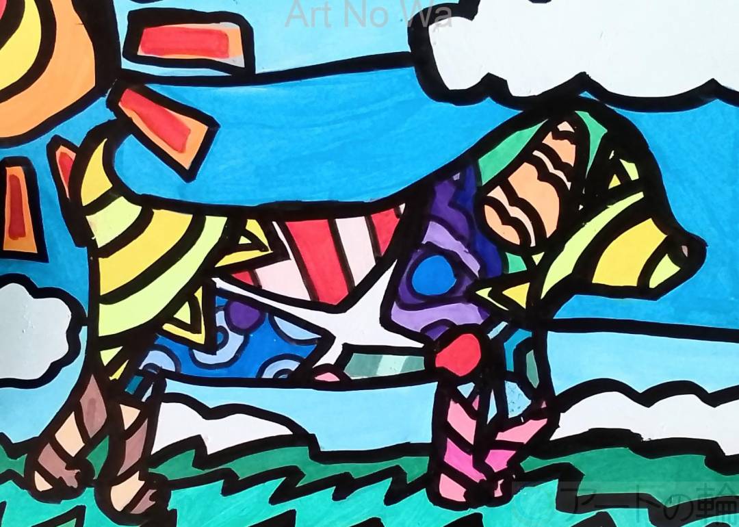 晴れやかな青空の下の草道を散歩している犬を描いてみました。