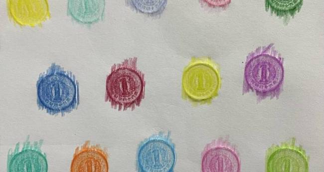 硬貨に紙を被せて鉛筆で塗りたくる…大概の人は一度はやった事があるのではないだろうか。それを色鉛筆を使って模様にしてみた。