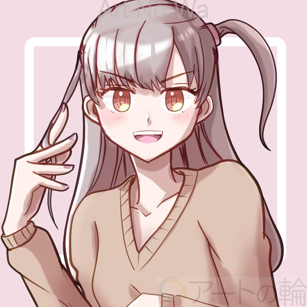 桃色と茶色んベースに、桃の甘酸っぱさを表現してみました。表情もツンとしながらも女子らしく髪をいじっています。