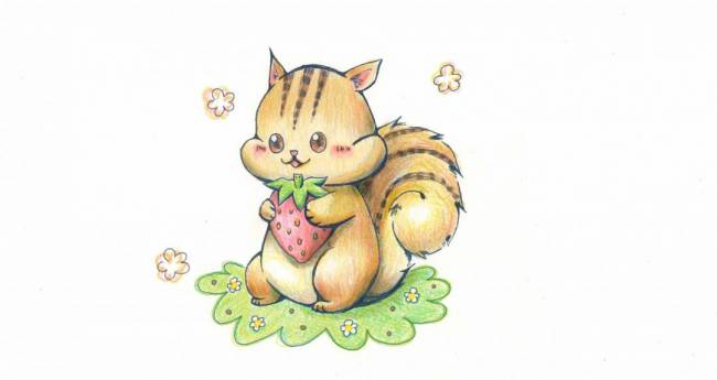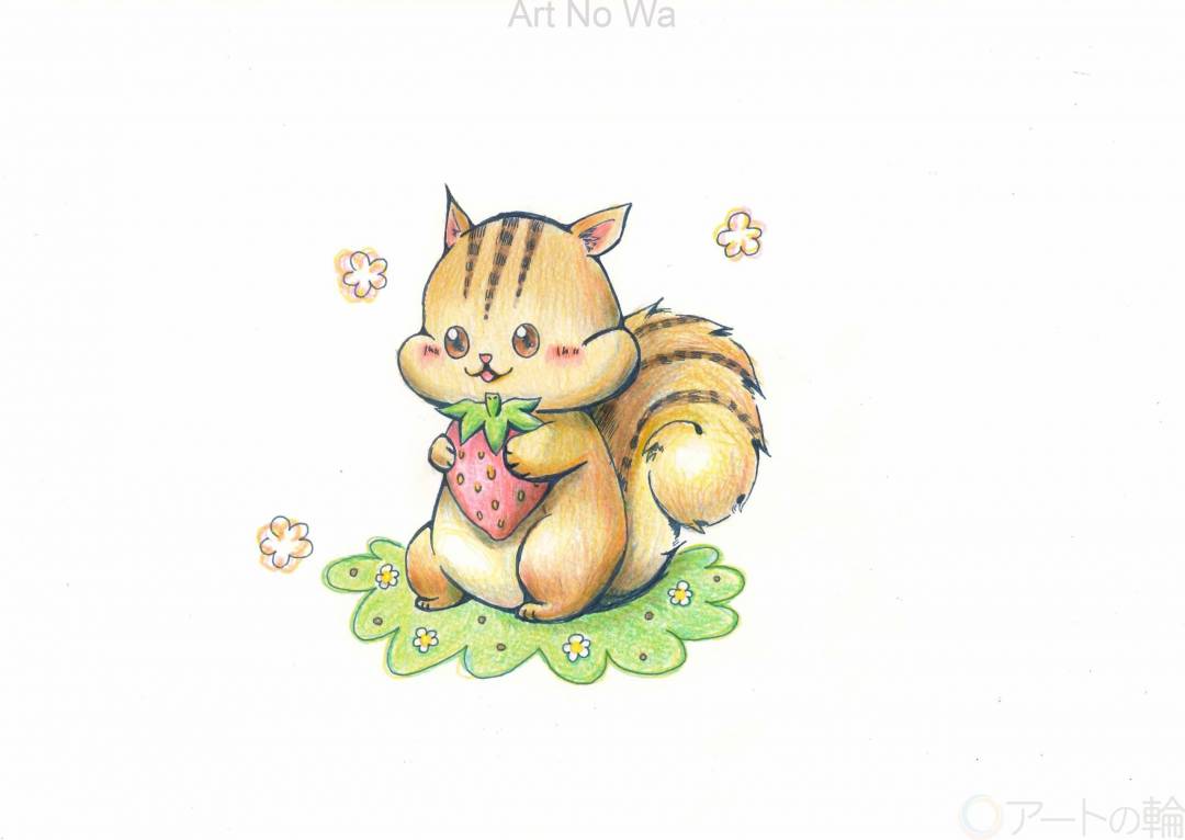 ぽかぽかな森の中、いちごを頬張るリスちゃんを描きました。様々な色を使い、光や影を表現しました。