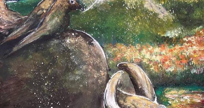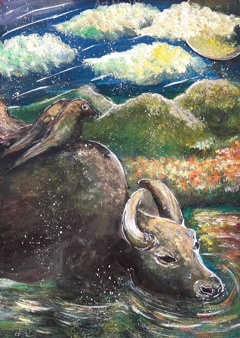 水牛と小鳥が月夜に集う様子を描きました。種は違えど、共存できる野生の世界もいいなと思いました。