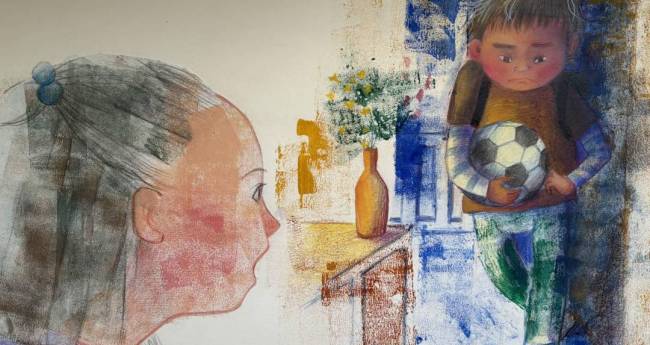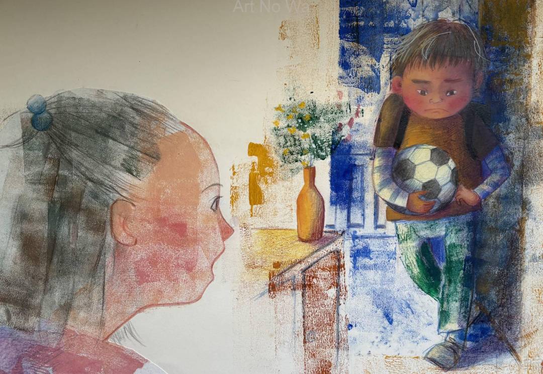 ピンポーン。 げんかんの チャイムが なりました。 げんかんに たっていたのは、 たけるくんでした。 たけるくんは ボールを だきしめて、 うつむいたまま。 なにも いえずに もじもじ。 そのとき—— すうちゃんの みみが、 ぴくり。 と うごきました。