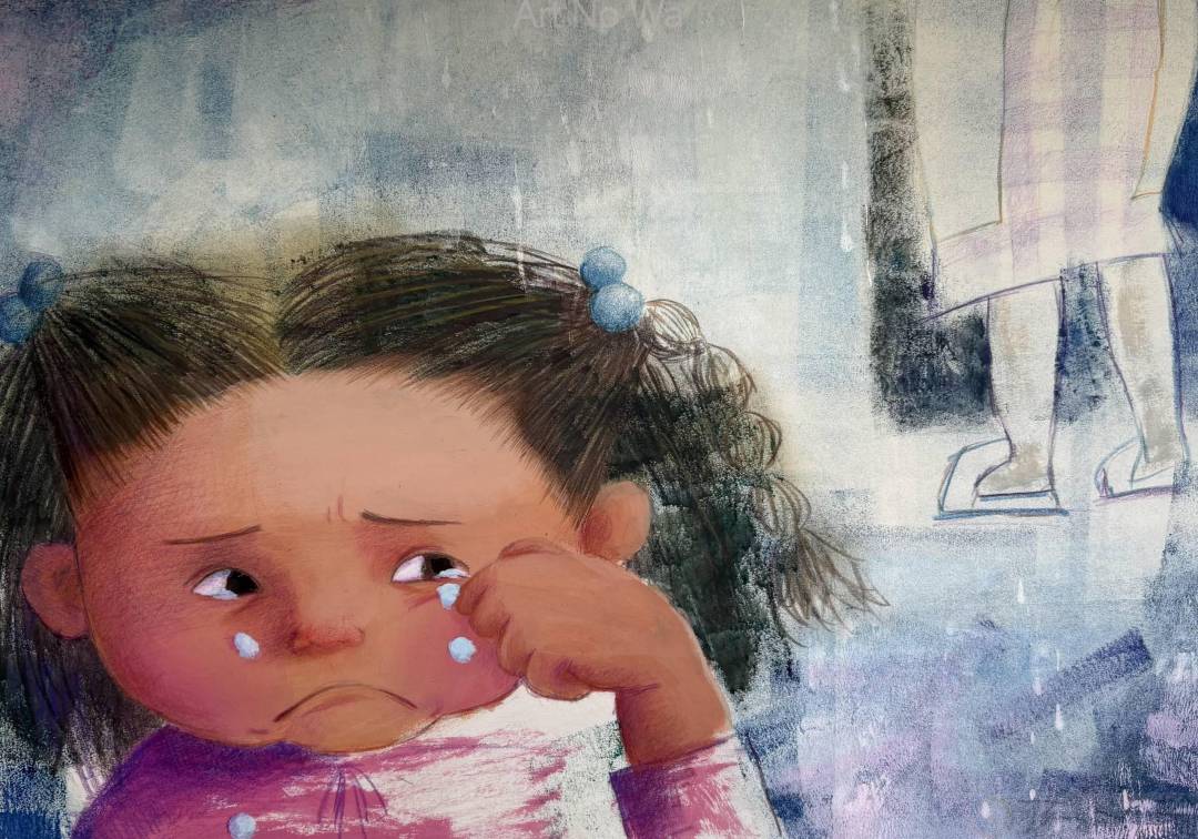 すると、おかあさんの こころのこえが すうちゃんの みみに とどきました。 「つかれたな…。 『だいじょうぶ?』って いってもらえたら それだけで うれしいのに。」 すうちゃんは、むねが きゅっとして、 なみだを ぽろり。