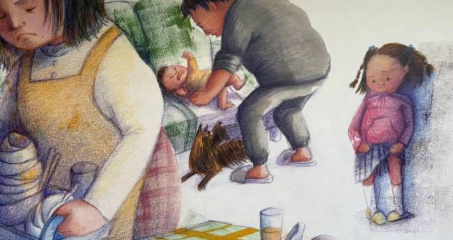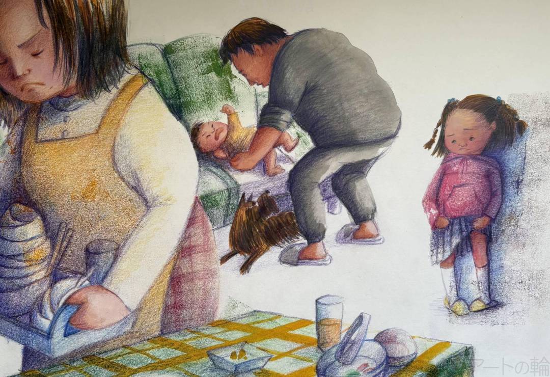 すうちゃんが いえに かえると、 おうちは まだまだ ばたばた。 おかあさんは ぷんぷん しているみたい。 すうちゃんは どきどき して、 おもいました。 「…さっき、にげたから おこってるのかな。」 そのとき、まほうの耳が きこえました。 「はぁ…つかれた…。 でも、すうちゃんのことは だいすき。」