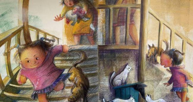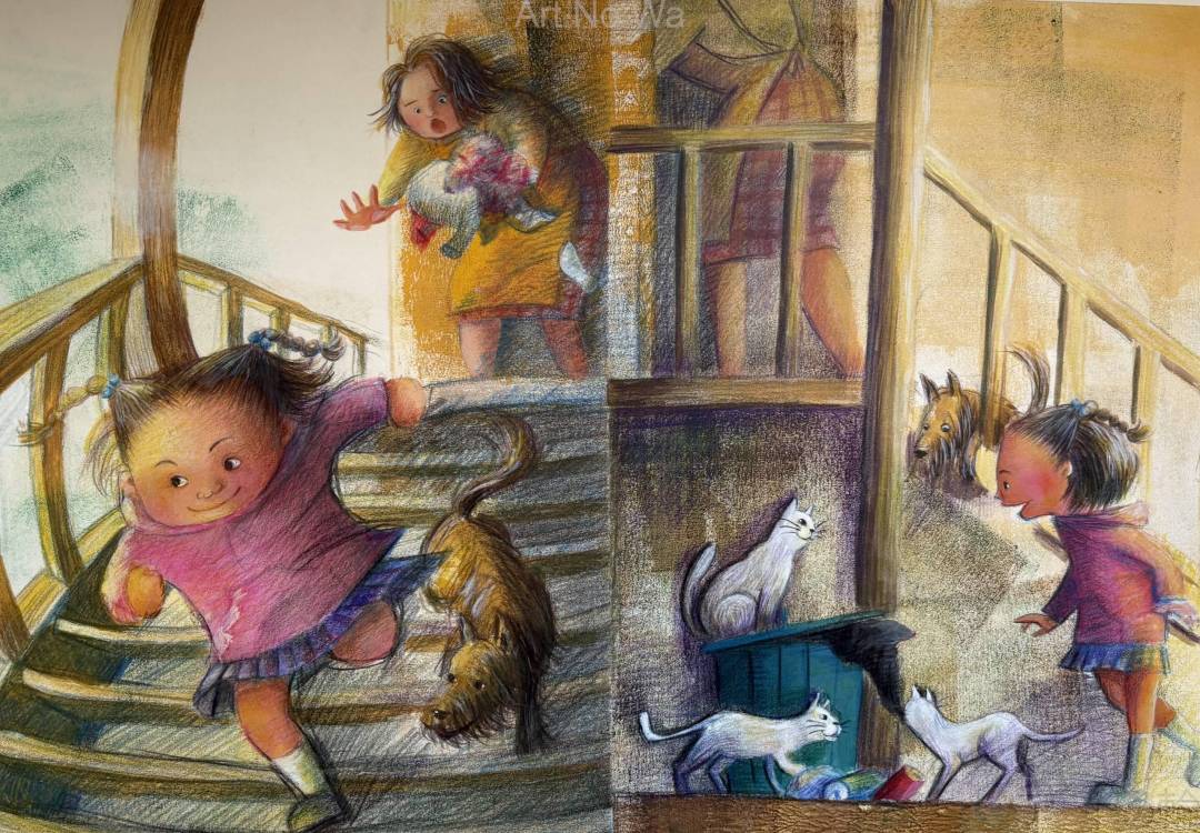 すうちゃんは いえの そとへ、 ぱっと とびだしました。 かいだんの かげに、ねこさんが さんびき。 すうちゃんは うれしそうに いいました。 「あなたたちの こえだったのね!」