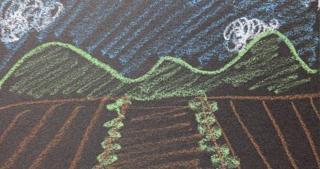 絵日記に書くような夏の田舎の風景を描きました。