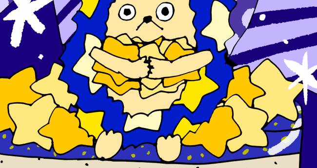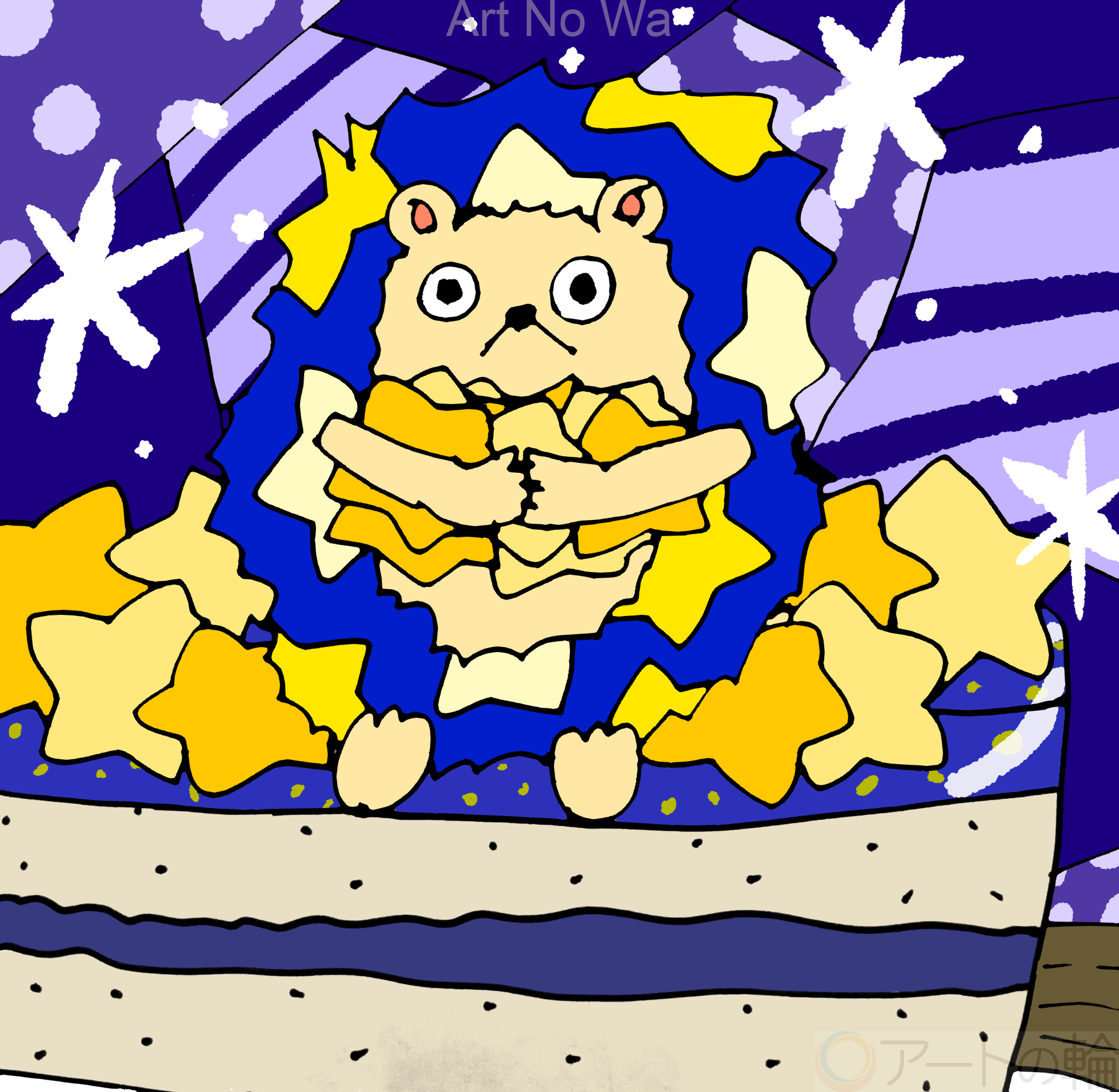 星空のように青いケーキの上で星を抱きしめている星柄のハリネズミを描いてみました。