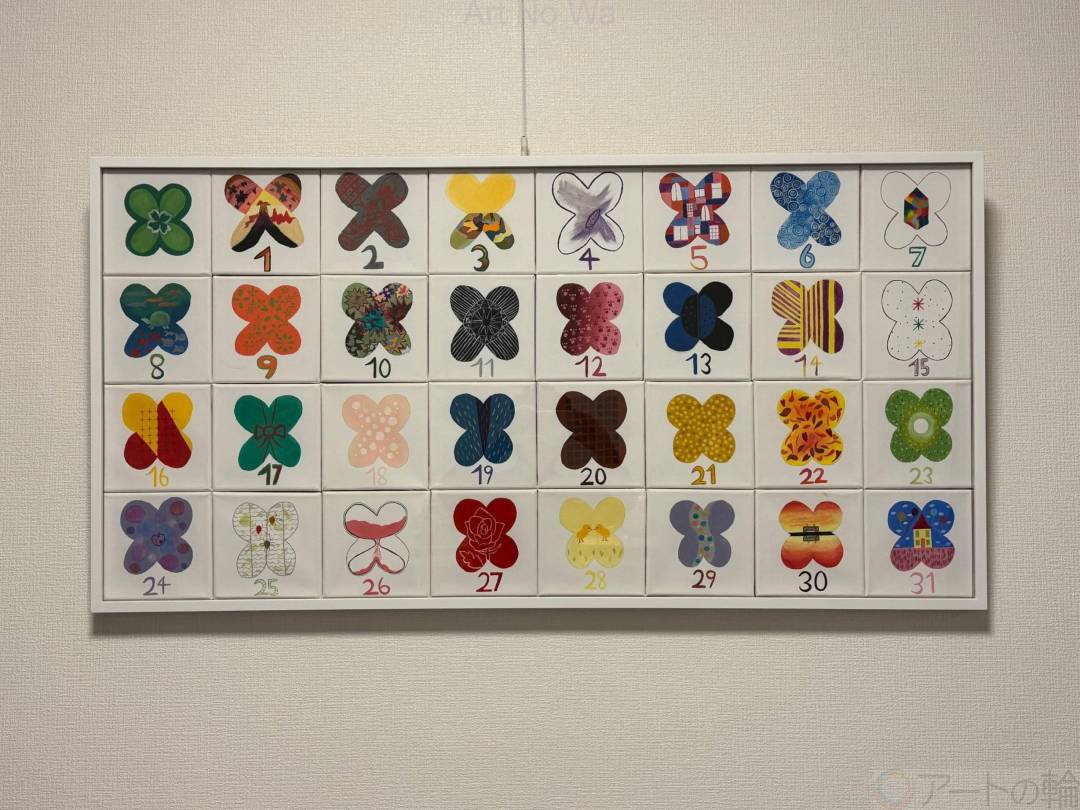 この作品は15㎝四方のキャンパスを32個 使ったカレンダーになります。日付の上に四 つ葉のクローバーが配置されています。それ ぞれ線や、色、形、模様が違っていて名前も あります。1日は「真っ赤な朝の富士山」1 3日「青黒クッキー」21日「キラキラゴー ルド」31日「帰ってきたお家」等です。我 が家ではマグネットの付く壁にプリントして 「今日」とか「記念日」の日付にマグネット のちびクローバーをくっつけて楽しんでいま す。作家が幼い頃から大好きなクローバーを独特のデザインでキャンパスに色とりどり に並べたカレンダーです。