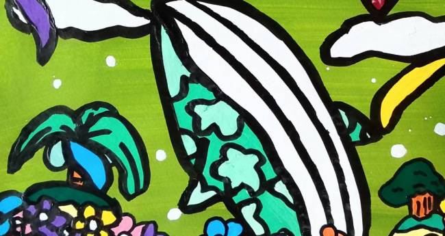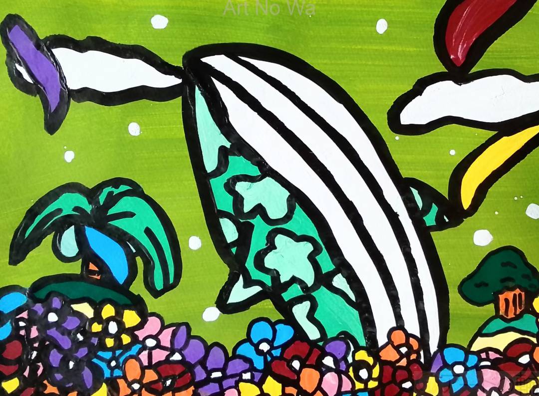花が沢山ある海でダイブして遊んでいるクジラを描いてみました。