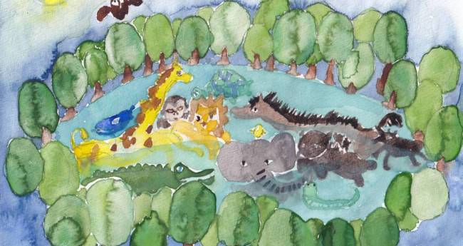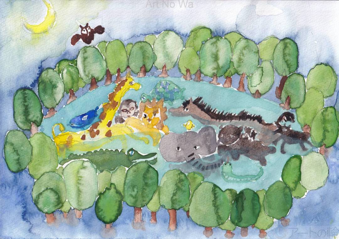 三日月がきれいな夜い、森の泉にたくさんの生き物たちが水浴びにやってきた。静かに、淡々と水中でで佇んでいる。平和な夜の一ページです。水彩絵の具
