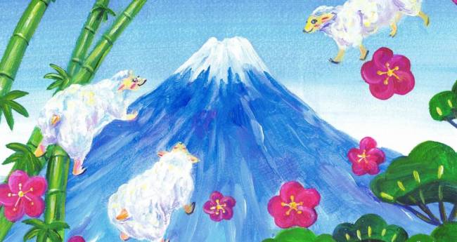 富士山を背景にかわいい羊たちが空を飛んでいます。おめでたい松竹梅も、この青い大空を祝福しているかの様に美しく舞っています。一年の始まりを、可愛く彩ってくれる。そんな一枚です。