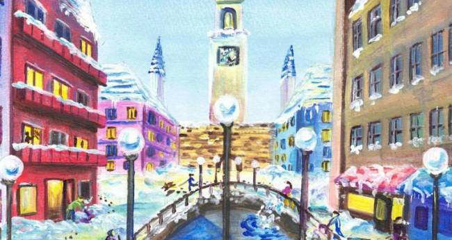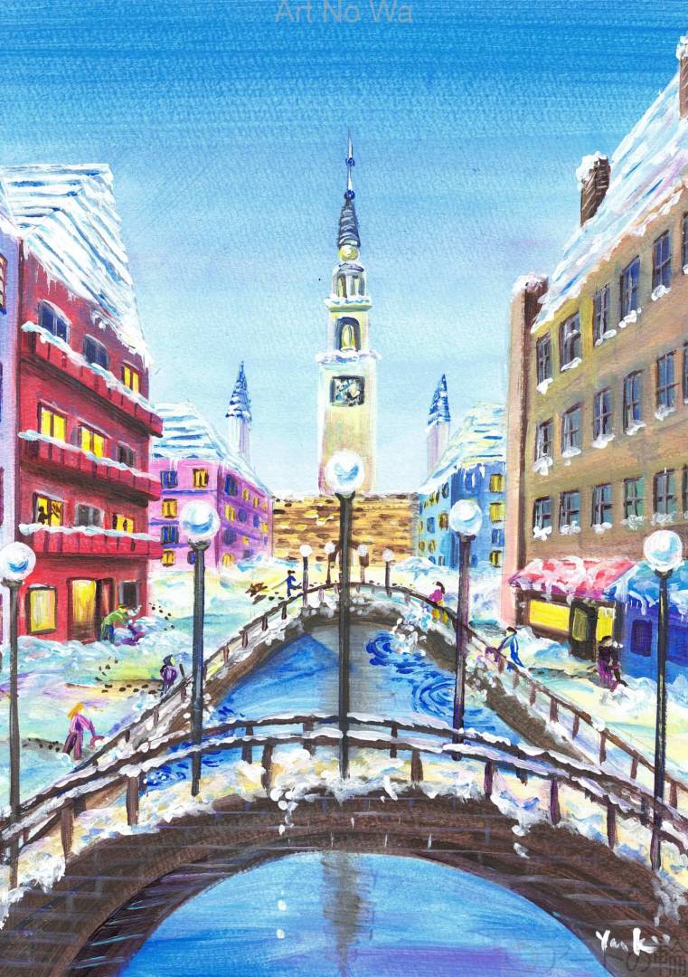 朝起きてみると、一面に雪が積もっていたので、雪かきをしているというワンシーンです。寒く、それでいて人のいるぬくもりがある。遠くで散歩している犬の雪が降った喜び。そんな日常を描きました。