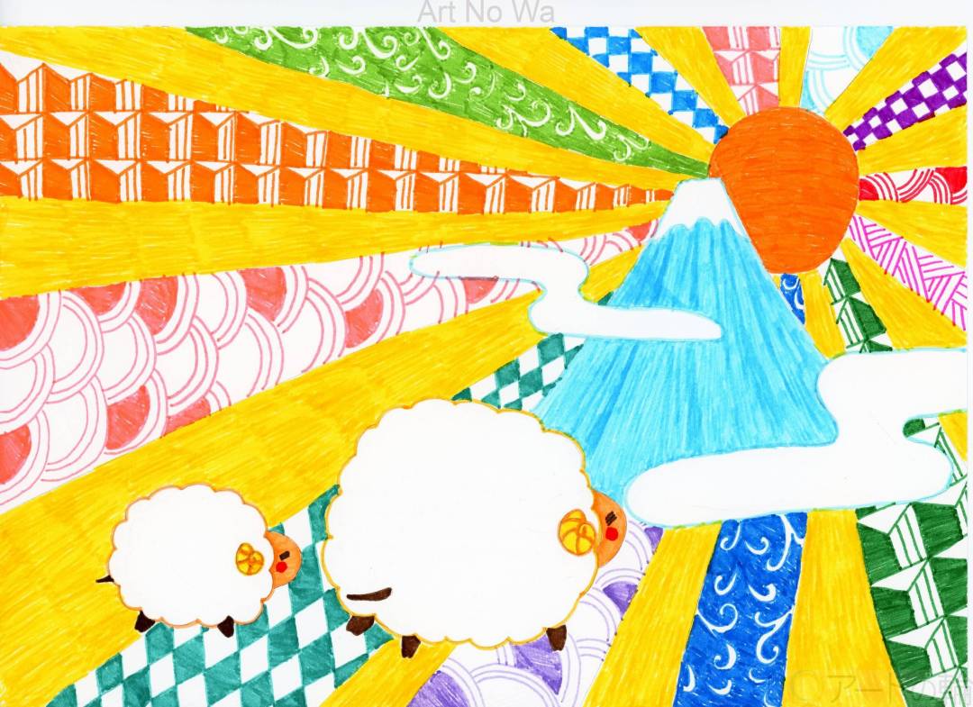 新たな一年の始まりを祝福するかのように、まぶしくて輝かしい朝日が昇っています。羊の親子も初日の出を見ることが出来て嬉しそうです。