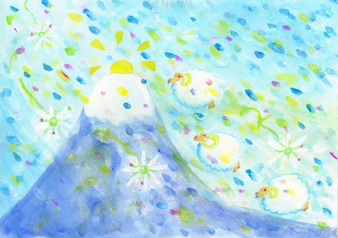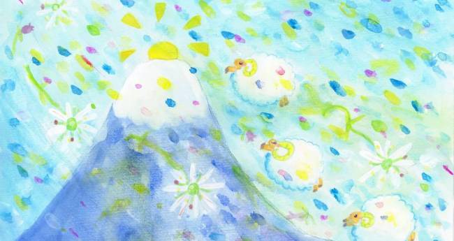 ダイアモンド富士のてっぺんへ、みんなで進む、羊たちを描きました。