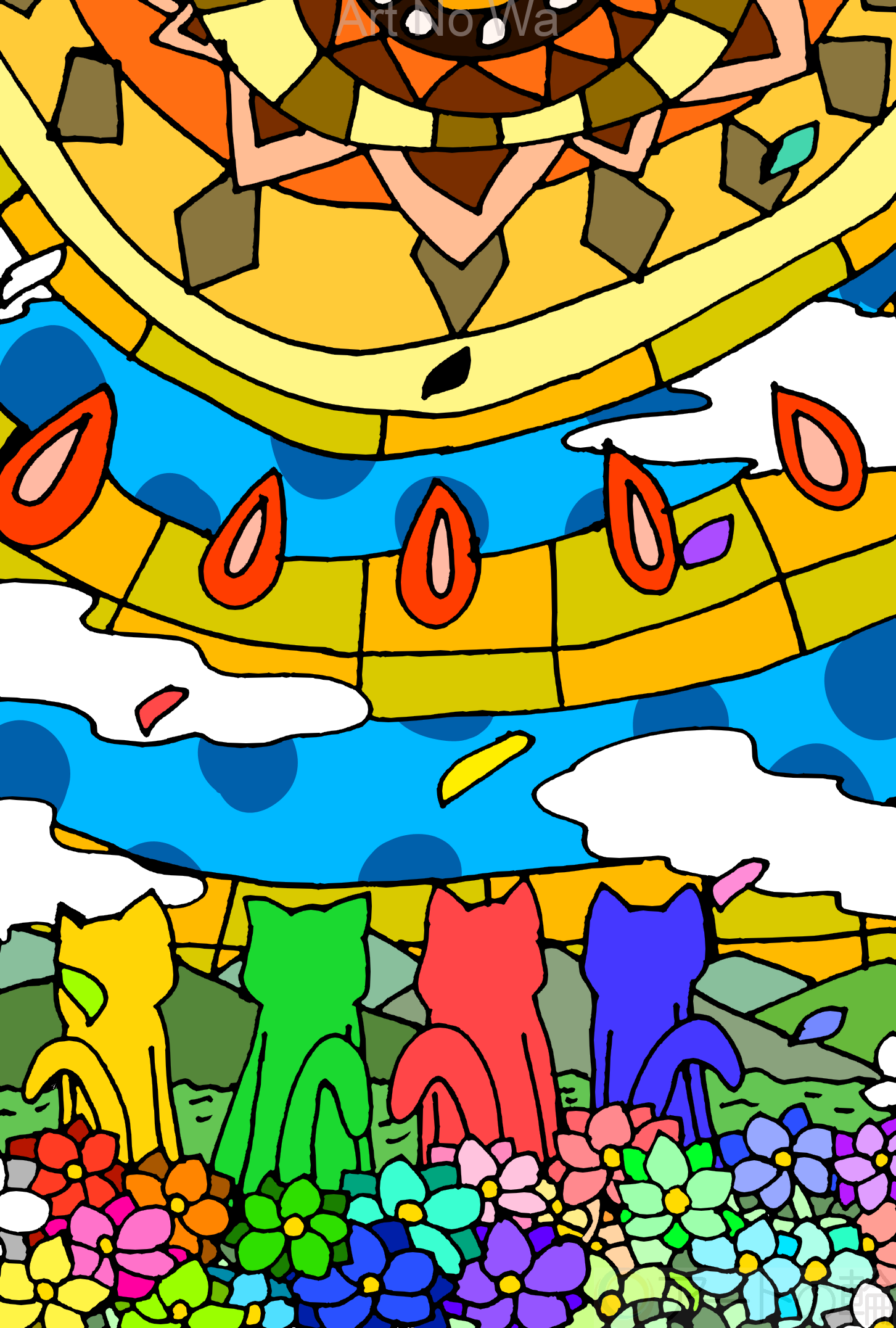 大きな太陽を見上げている仲良しな4匹の猫を描いてみました。