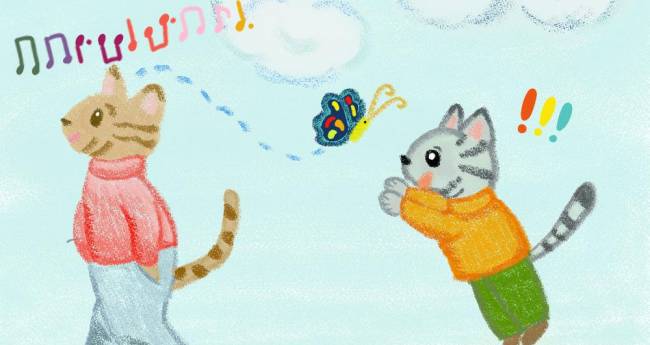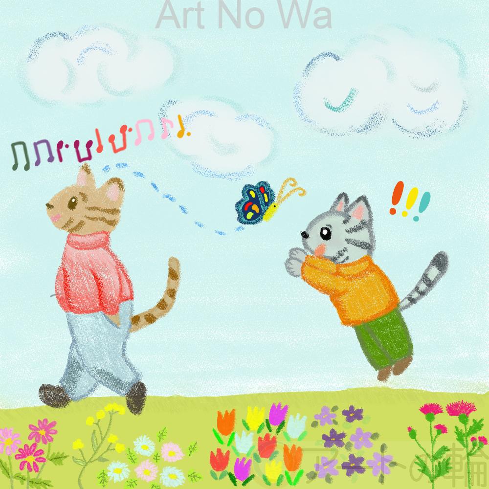 架空のねこ兄弟、散歩に出掛けました。兄は鼻歌フンフンフン♪ 弟はお気に入りのちょうちょを見つけました。勝手気ままなふたりです。