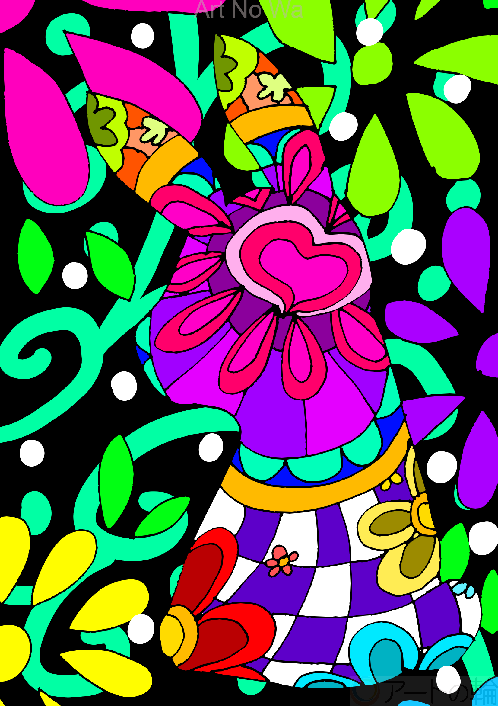 背景も体の模様も植物だらけの兎を描いてみました。