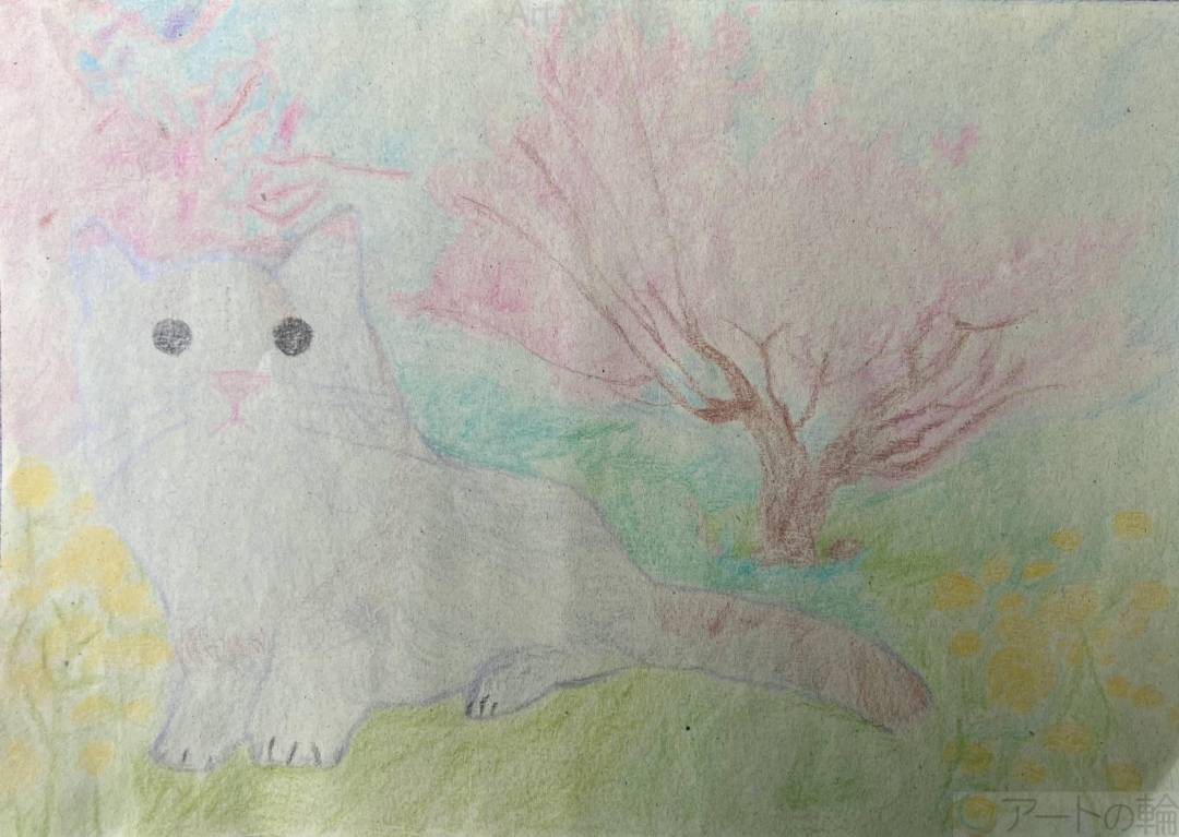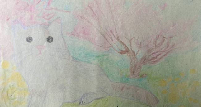 菜の花と桜のそばでまったりしているネコを絵がいてみました。ネコの種類はラグドールです。