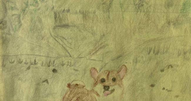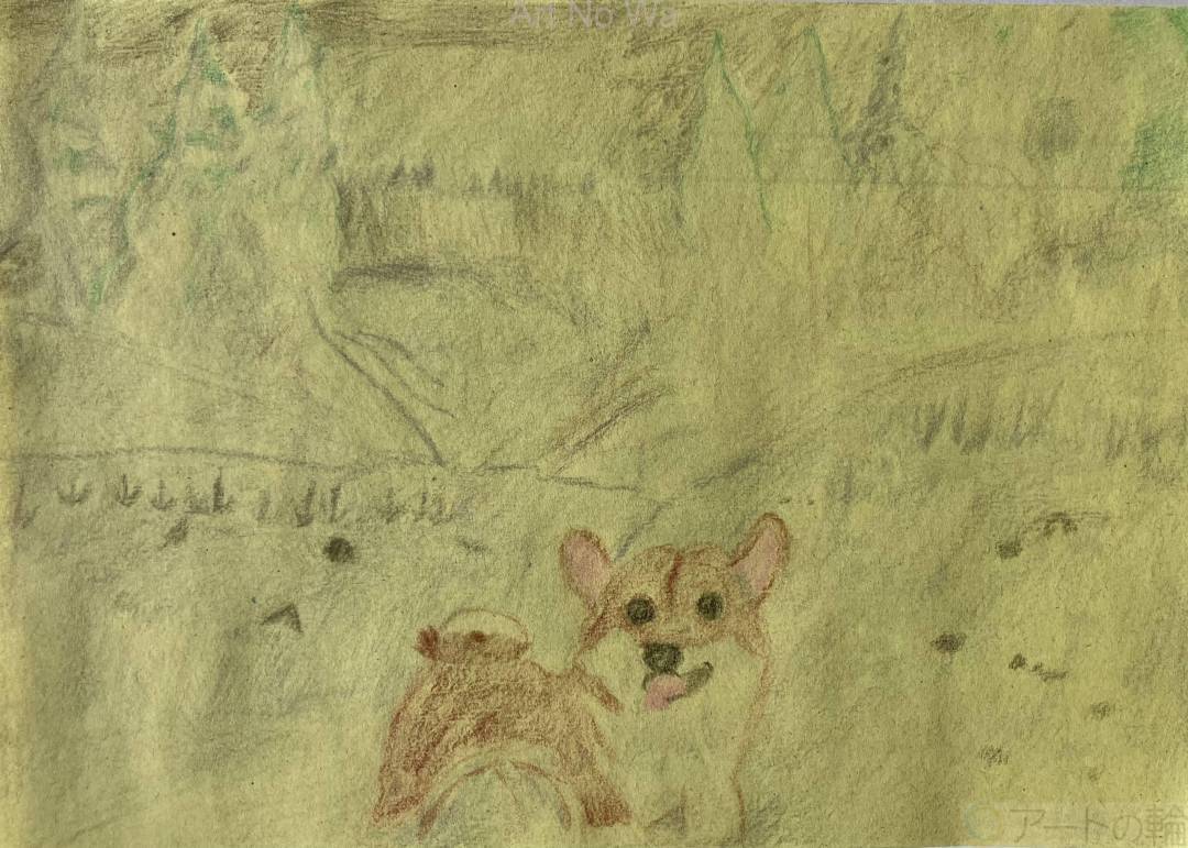 雪山で遊ぶ犬をイメージして絵がいてみました。犬種は柴犬です。秋田犬とは大きさが違うみたいです。