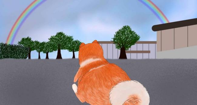 虹を見ながら物思いにふける秋田犬を背中から描いてみました。虹の感じや背景にこだわりました。
