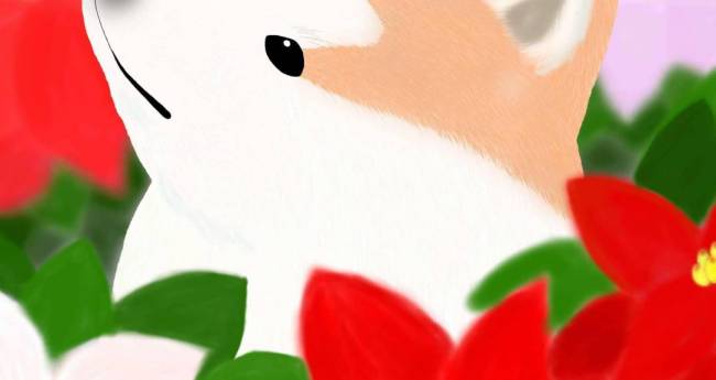 花と秋田犬シリーズ、今回は「ポインセチア」です。ポインセチアに囲まれた可愛い秋田犬を描きました。立体感を出す為に、背後のポインセチアをぼかしてみました。