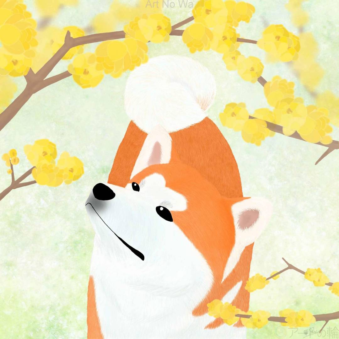 花と秋田犬シリーズ、今回は「蝋梅」です。梅にするか蝋梅にするか悩みましたが、蝋梅にしました。蝋梅を見上げる秋田犬を描きました。奥の花をぼかして立体感を出しました。