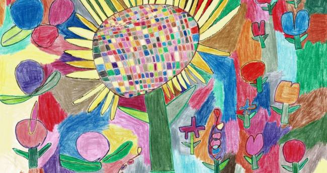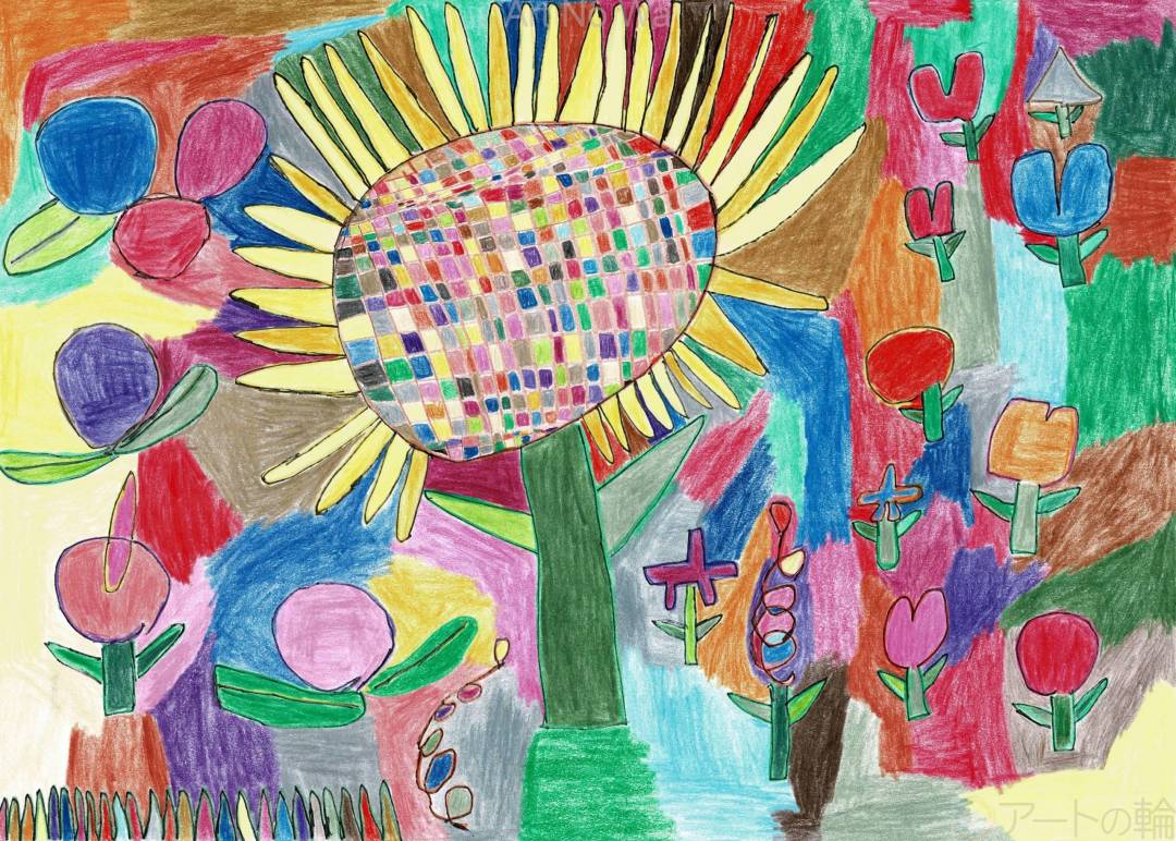 ひまわりの花を真ん中に大きく描きました。まわりにもいろんな花を描きました。