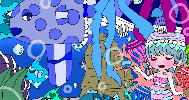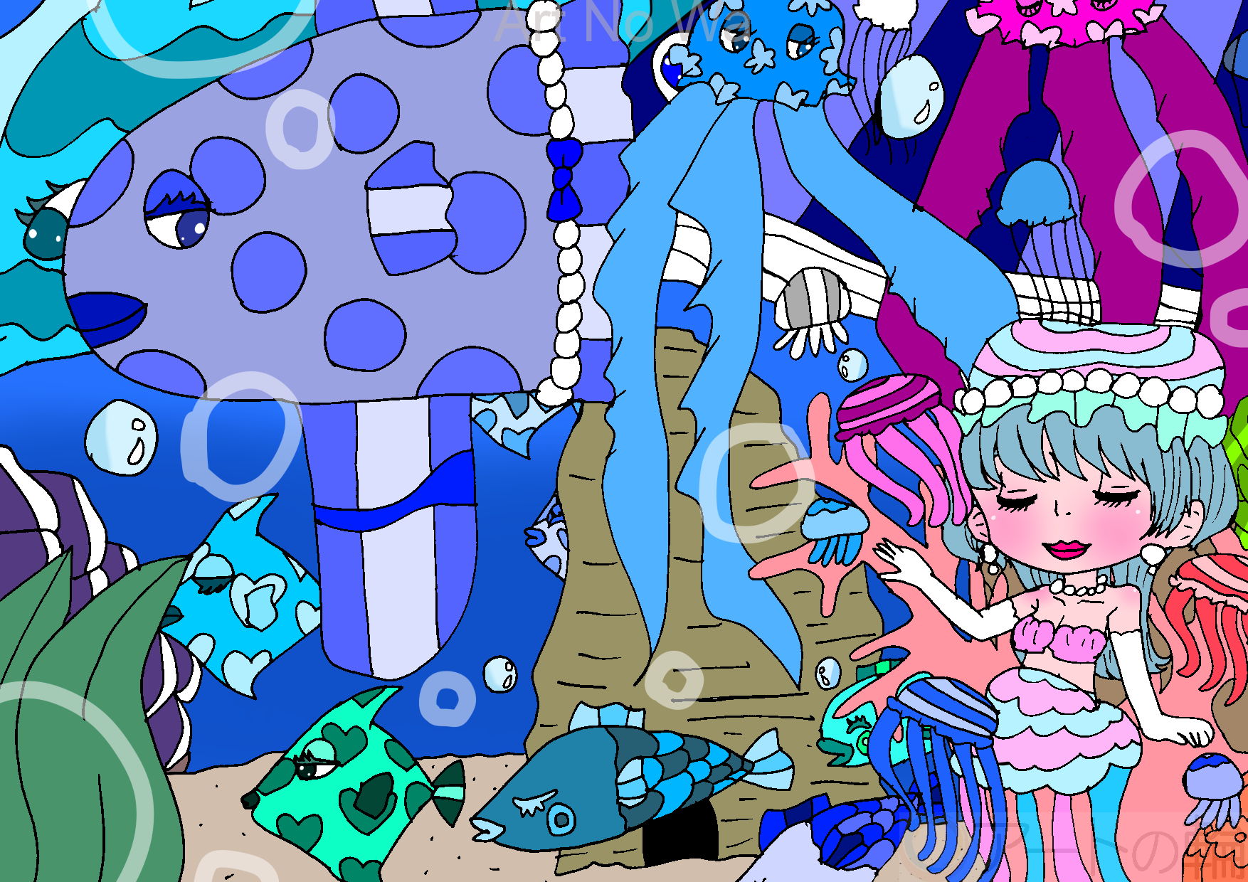 優雅に泳いでいる海の生き物のそばでくつろいでいるクラゲの女性を描いてみました。