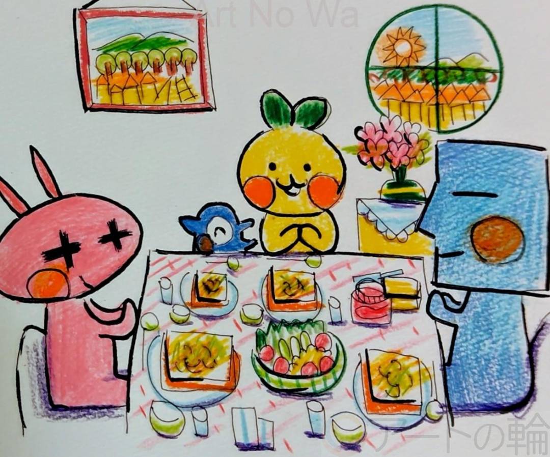 朝の食卓です。 いただきます!ポロは、いいます。 パパの作るトースター最高だな。 ポポリも、言います。 ありがとうね。 モアイパパは、いえいえと。 照れました。 今日も頑張って行こうな。 と、朝の風景でした。