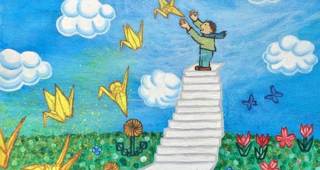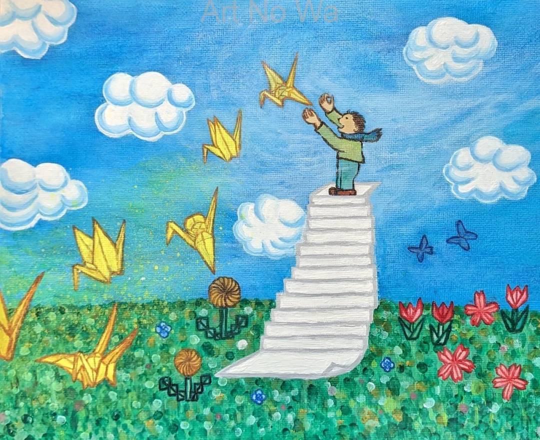 折る力も、描く力も、微力ではあるけれど…。 ボクの手で折った鶴、どこまで、飛ぶだろう。どんな風に、飛ぶだろう。(あれれ?、思い描いていたよりも、低空飛行だけれども…。) 少しでも、飛ぶといいなぁ…。長く飛び続けるといいなぁ…。お花も、かわいく咲くといいな。