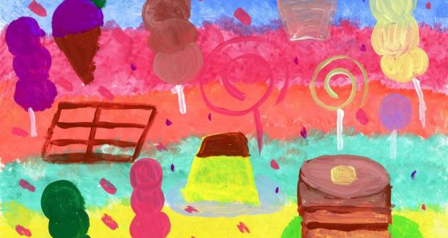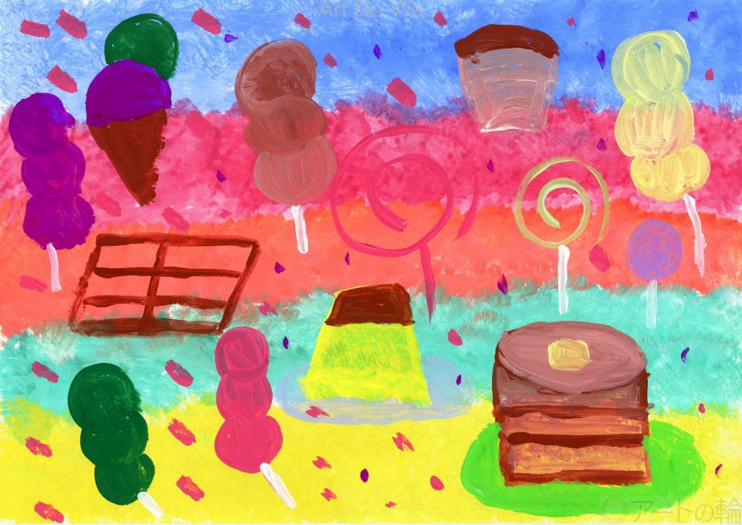 皆が喜ぶあめやキャンディや金平糖が空から降ってきたら子供達が嬉しそうな姿を想像して描きました。 画材 アクリル絵の具