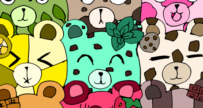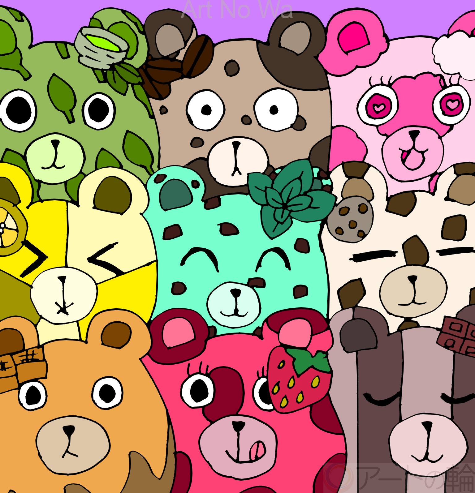 色んなアイスの味の模様のクマを沢山描いてみました。人も十人十色違うように、食べ物も十人十色ですね。