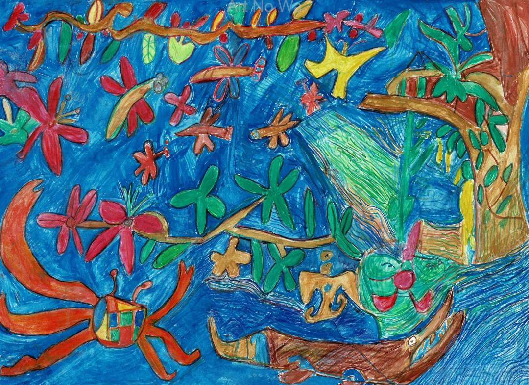 人の顔をしたカメを描きました。水の流れを細かく描いたので時間がかかりました。