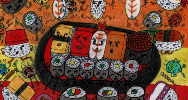 寿司がグランドを走っている絵を描きました。一つ一つのお寿司の様子を楽しく描けました。