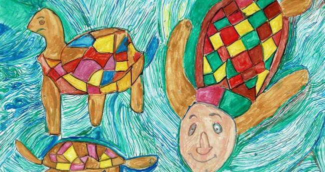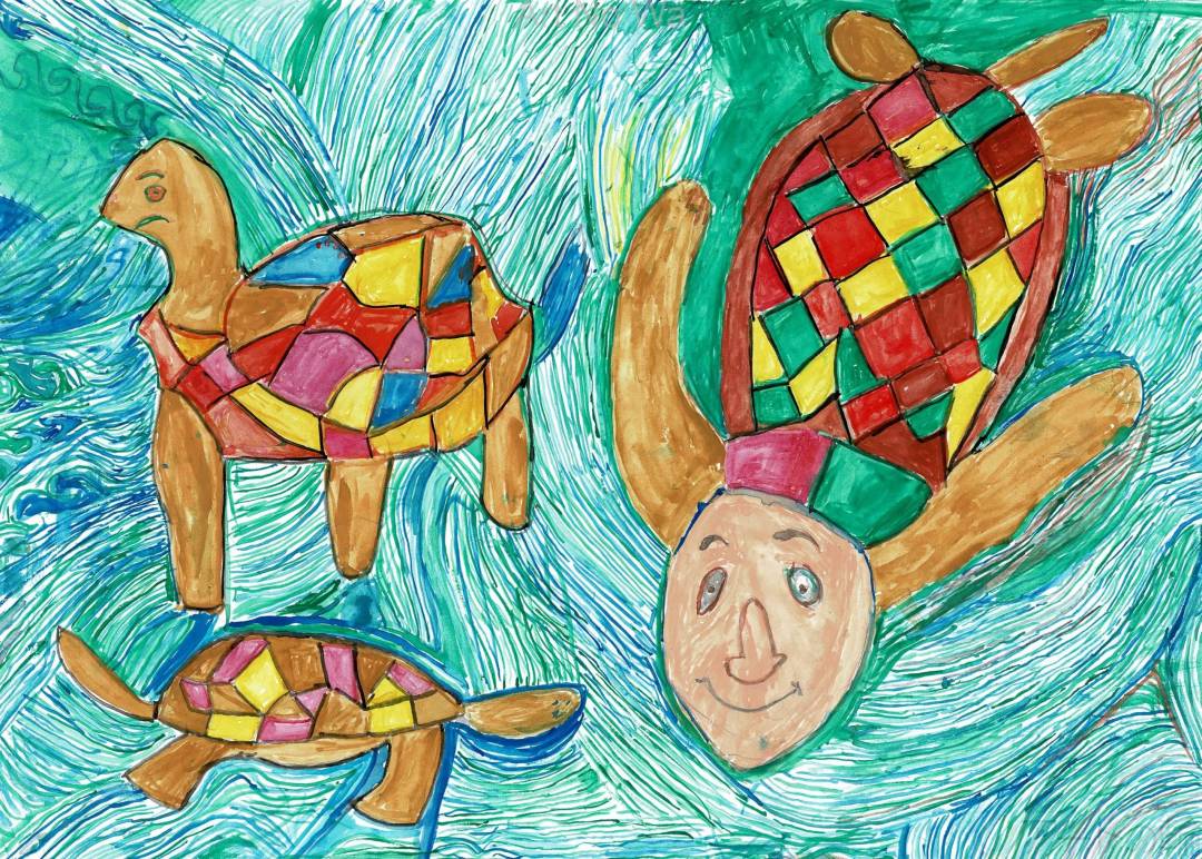 じーっと見てたら人の顔に見えたので、人の顔のカメを描きました。水の流れを細かく描いたので、時間がかかりました。