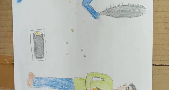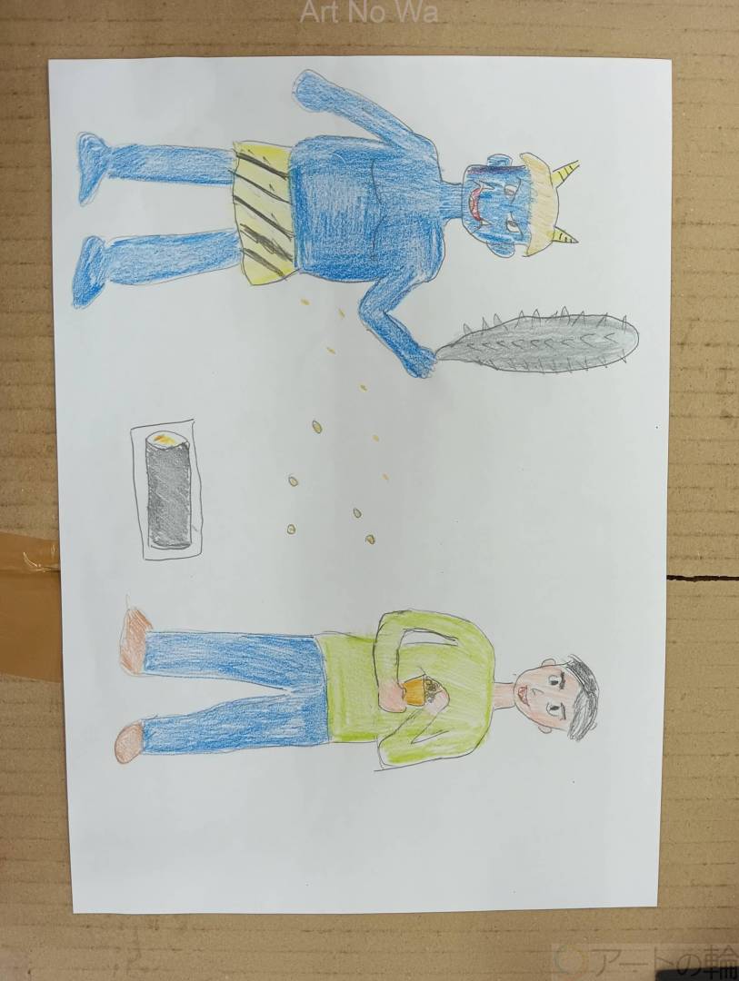 豆まきで鬼を払う絵です。鬼の顔を描くのに苦労しました。