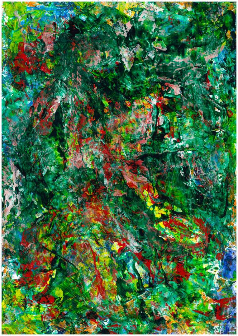 透明と不透明のアクリル絵具を何度も塗り重ねました。完成したと感じた時に、心に浮かんだ言葉が「草木のカンパネラ」でした。散歩の時に見かける道端の何気ない草木のカンパネラです。日常に当たり前に存在する草木も、引きこもったり閉鎖病棟にいたから、尊いと想えます。色々経験して積み重なった、私の心の宝物を色彩で表現しました。