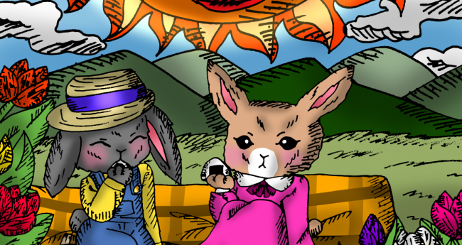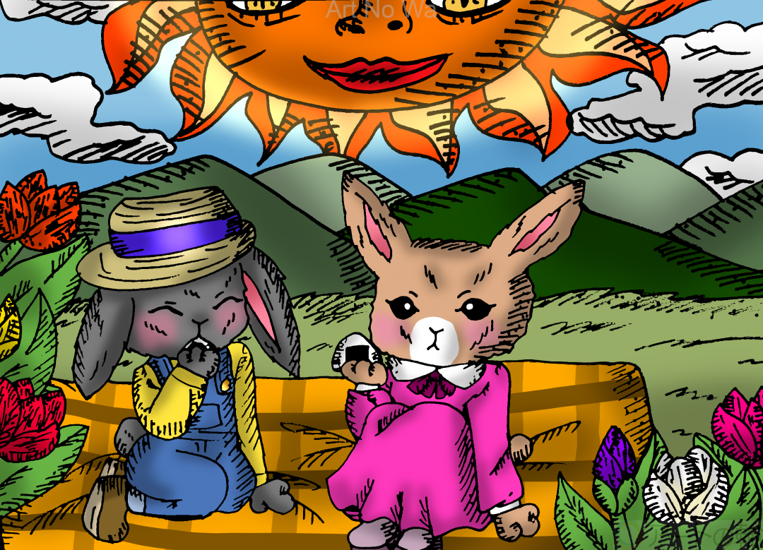 太陽の下の野原でピクニックをしている二兎の兎を描いてみました。