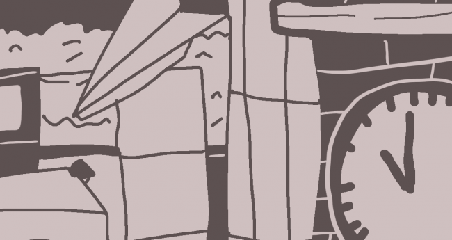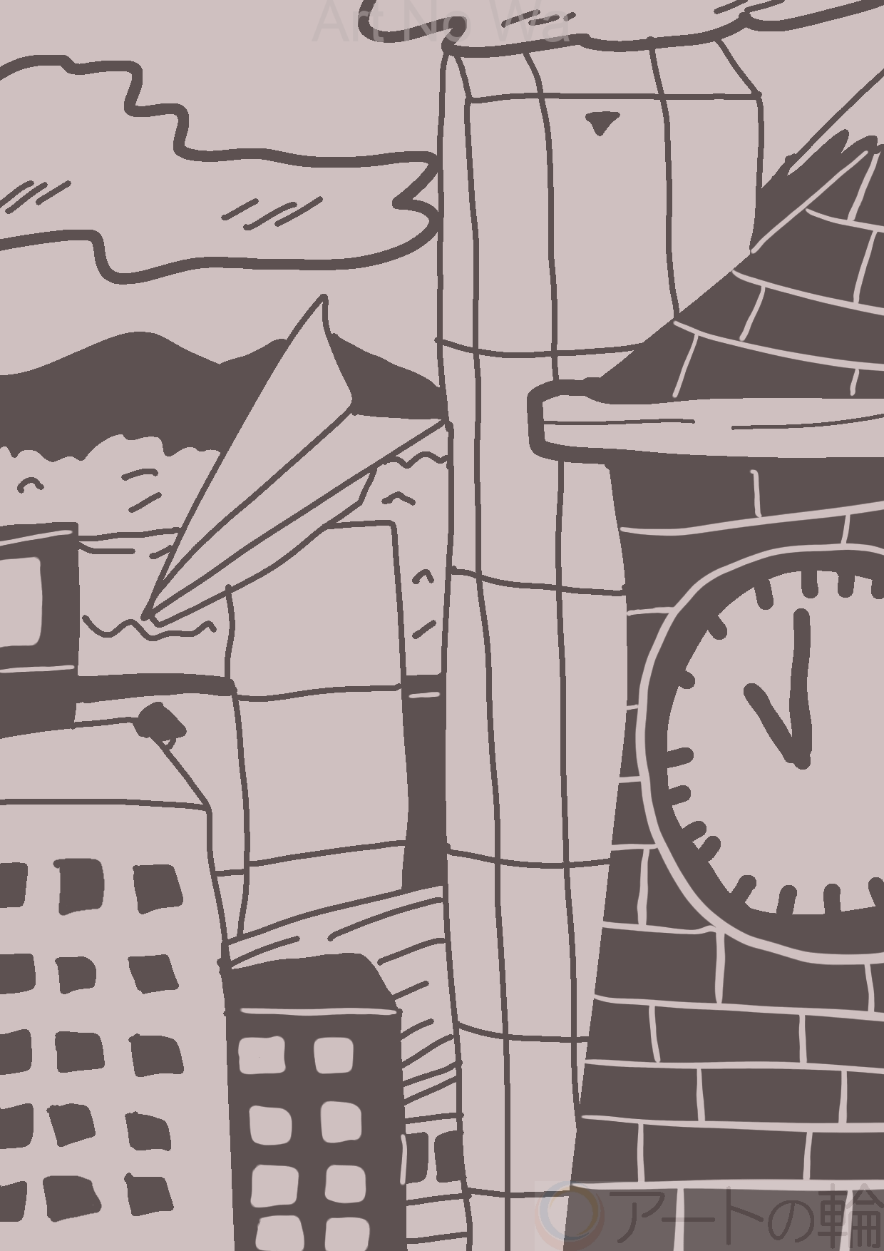 街中を空中で飛びながら冒険している紙飛行機を描いてみました。