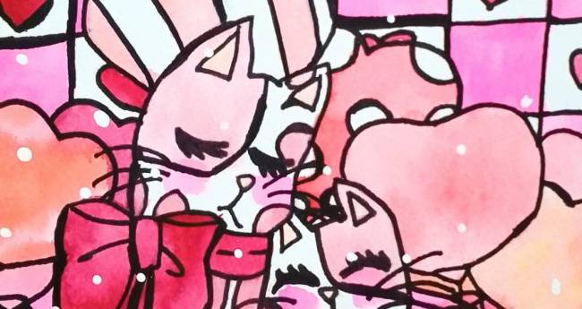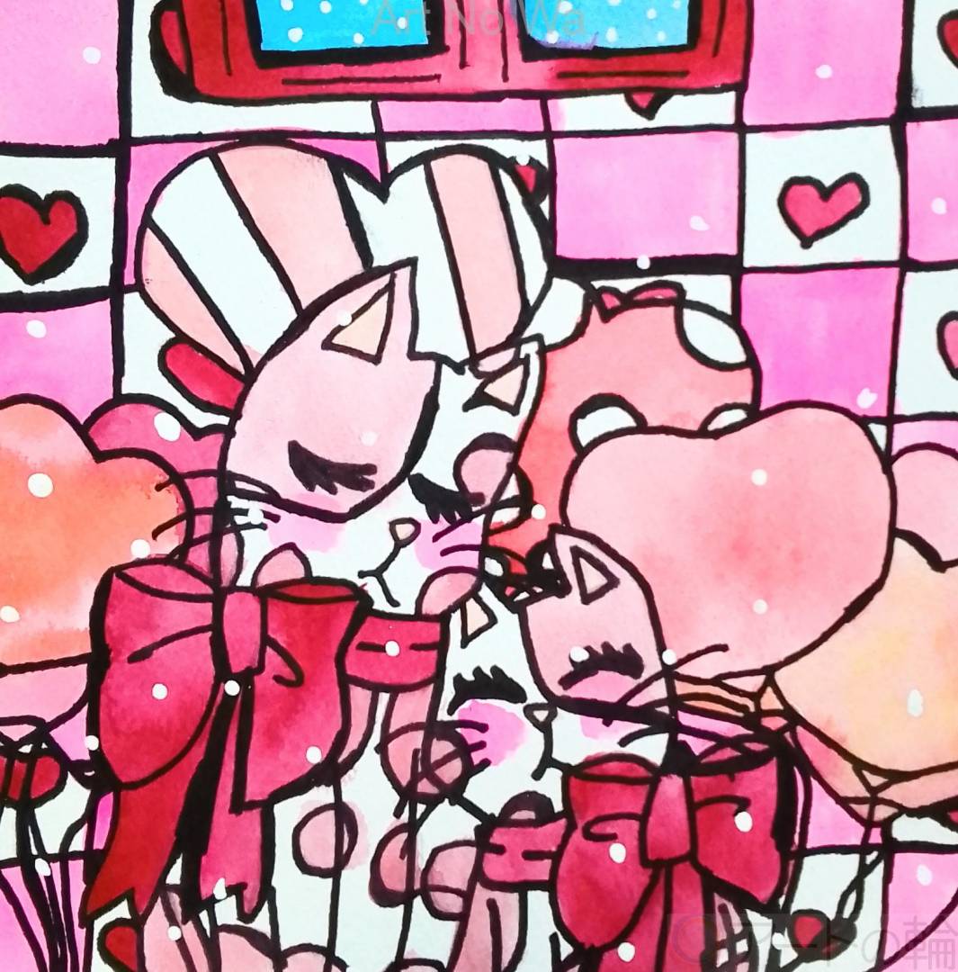 お揃いのリボンを付けて愛し合っている2匹の猫を描いてみました。
