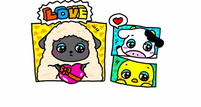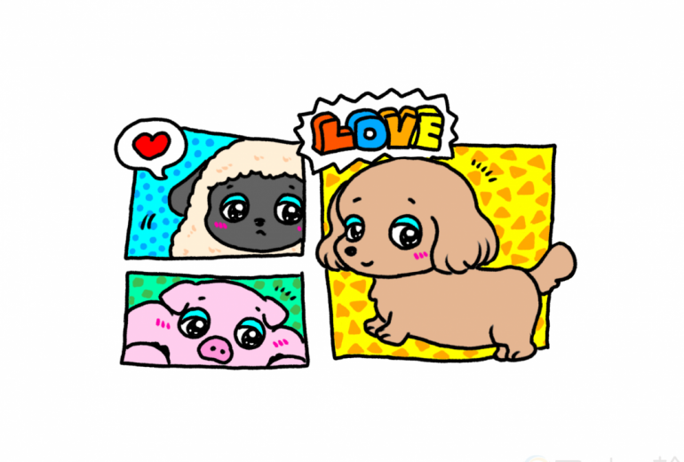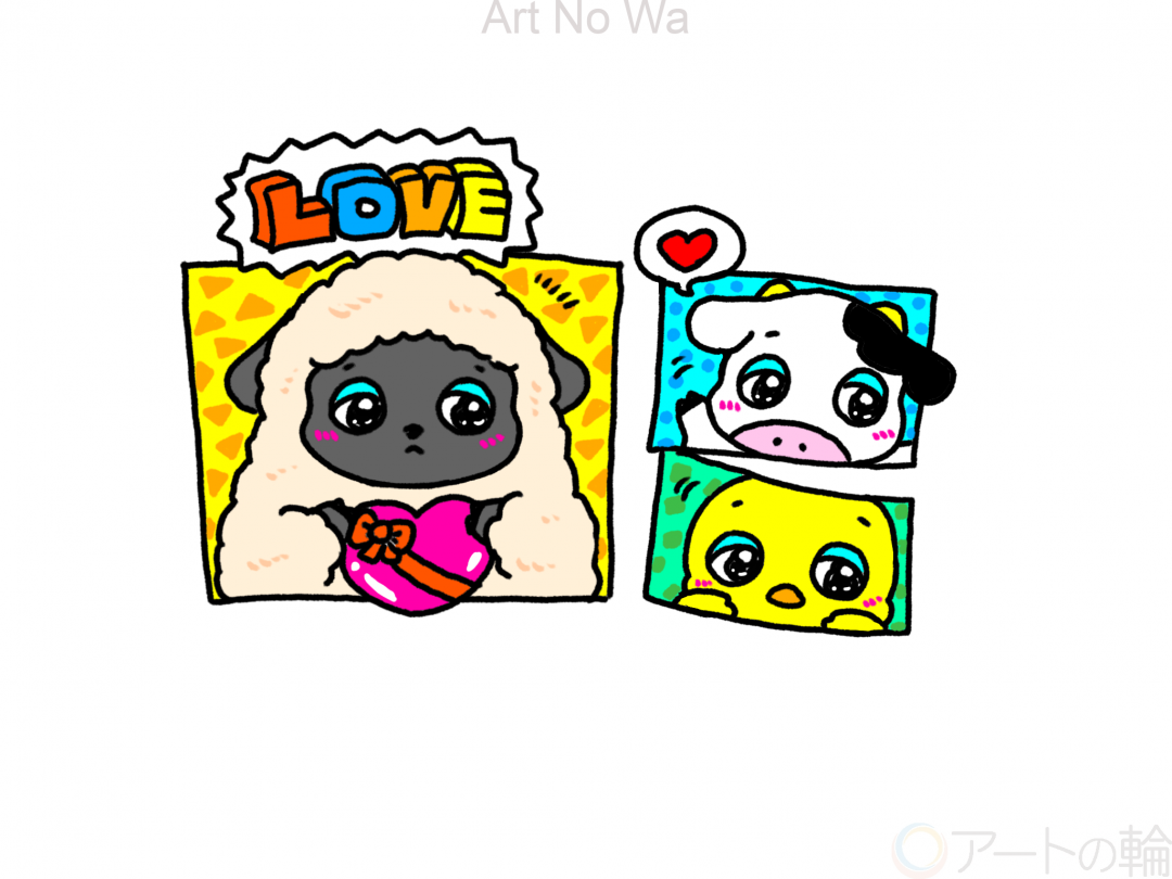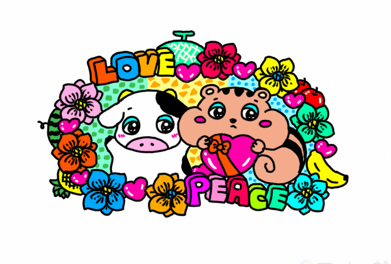 カラフルでポップな動物の絵です。愛と平和への思いが込められています。