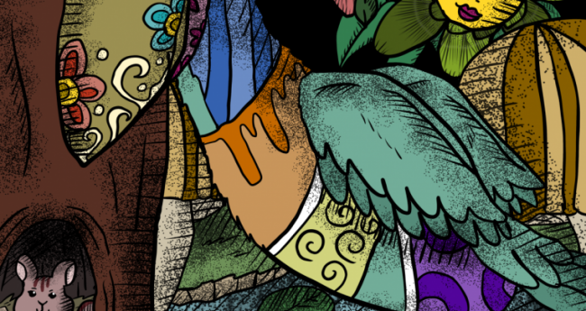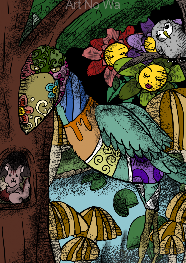 森の中を旅して冒険しているハシビロコウを描いてみました。