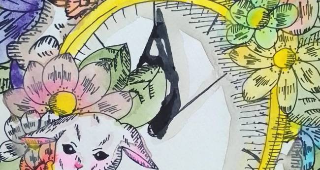 時を知らせている花やウサギに囲まれている懐中時計を描いてみました。