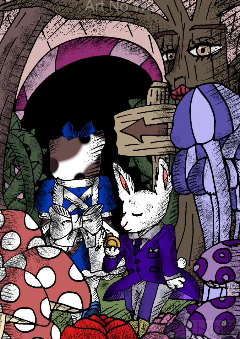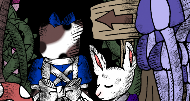 猫の少女を不思議な森に誘っているスーツ姿の兎を描いてみました。