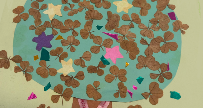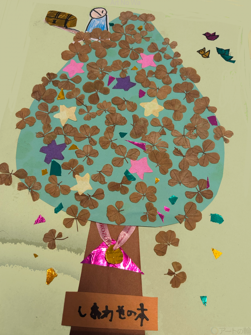 子供の頃に作った見つけた四葉のクローバーを押し花にして貼り付けて木のアートに、四葉のクローバーの葉っぱ幸せになりますように。木の上に宝箱が宝箱の前には守神が…?